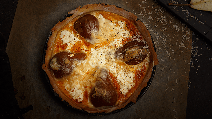 - Die Birnen schneiden und auf dem Kuchen verteilen.